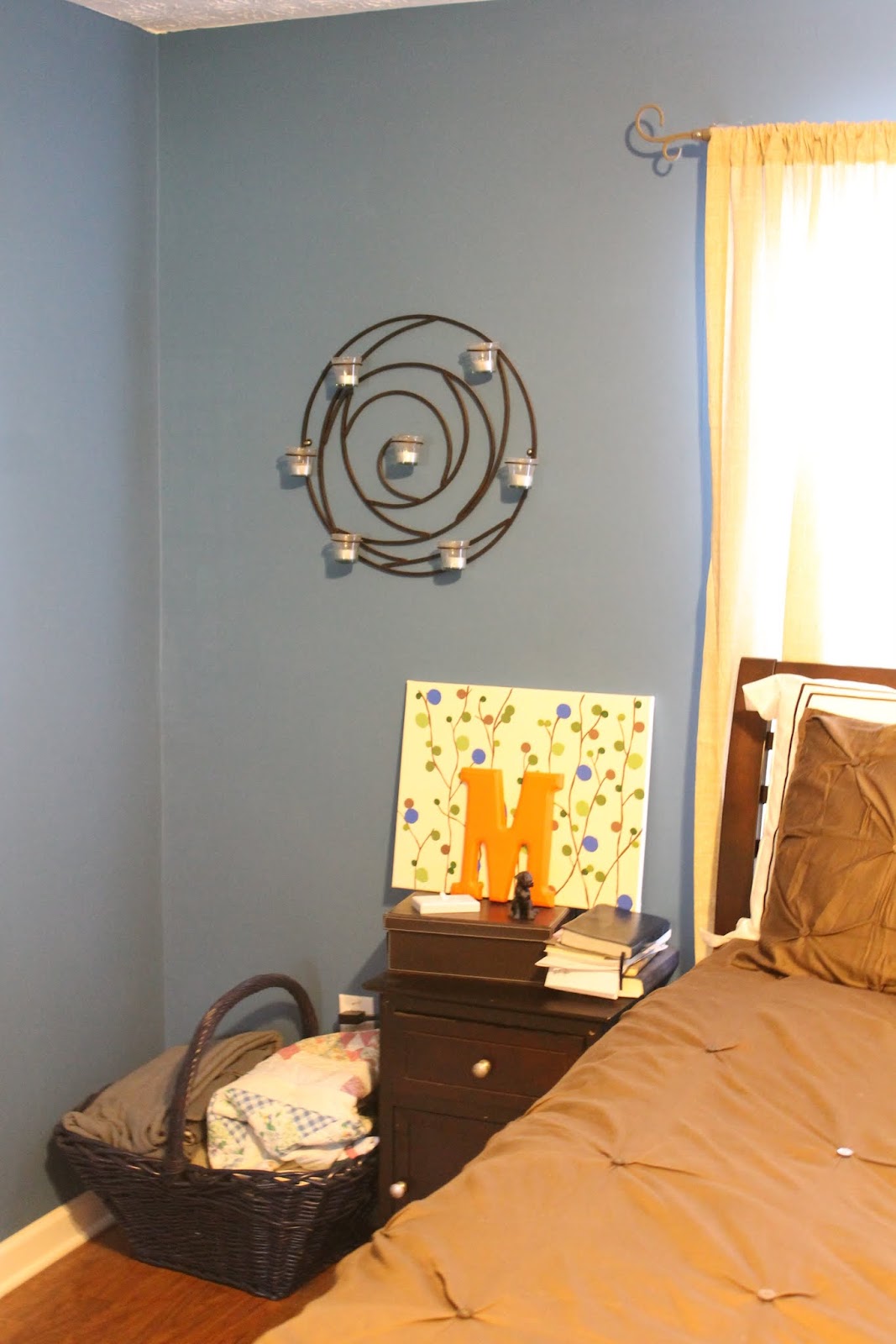 It's kind of hard to tell in these pictures, but the walls are kind of tan (boring) and the bedspread is green...although they sort of look the same in these pictures. Oops.